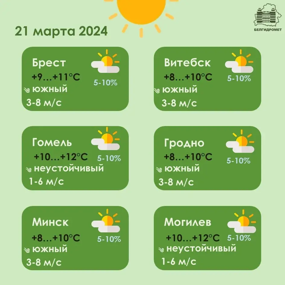 В ночные часы температура воздуха составит от -4 до +2 градусов (в Минске — от 0 до -2), в дневные часы — от +6 до +12 (в столице — 8-10 тепла).