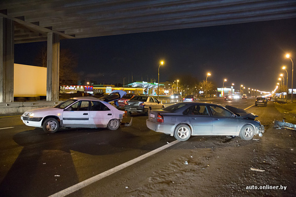 Именно это происшествие спровоцировало еще одно столкновение, в результате которого были повреждены еще несколько машин. Очевидцы говорят, что машины были разбросаны по всем полосам и в кювете. Затор на кольцевой стоял от самой Лошицы.
