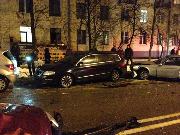 Большая авария произошла около 21 часов 30 января в Минске на улице Жилуновича. Как пишет onliner.by, автомобиль Renault на большой скорости и без света ехал в сторону Партизанского проспекта. Водитель не мог держать дистанцию и врезался в BMW, ехавший перед ним. BMW отбросило на обочину в припаркованные машины. Там он повредил два автомобиля — Mercedes и Volkswagen Passat.
