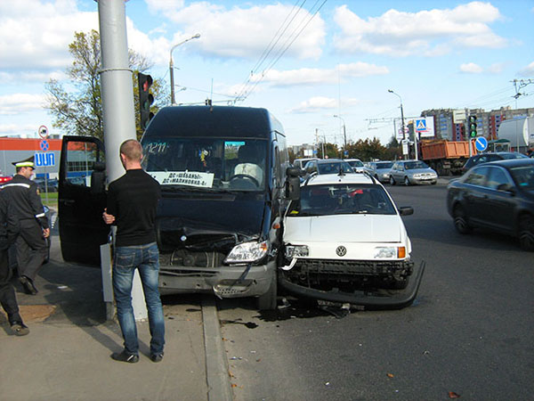 Столкнулись маршрутный автобус "Мерседес Спринтер" и автомобиль "Фольксваген Пассат". Как сообщают "Минск-Новости", микроавтобус двигался по маршруту "Шабаны — Малиновка-4" по улице Ванеева в первой полосе от площади Ванеева в сторону улицы Денисовской. В это же время легковой автомобиль ехал обратно в третьей полосе. На перекрёстке, когда загорелся зелёный сигнал светофора, водитель "Фольксвагена" неожиданно для всех стал выполнять левый разворот. В этот момент и произошло столкновение с маршрутным автобусом.