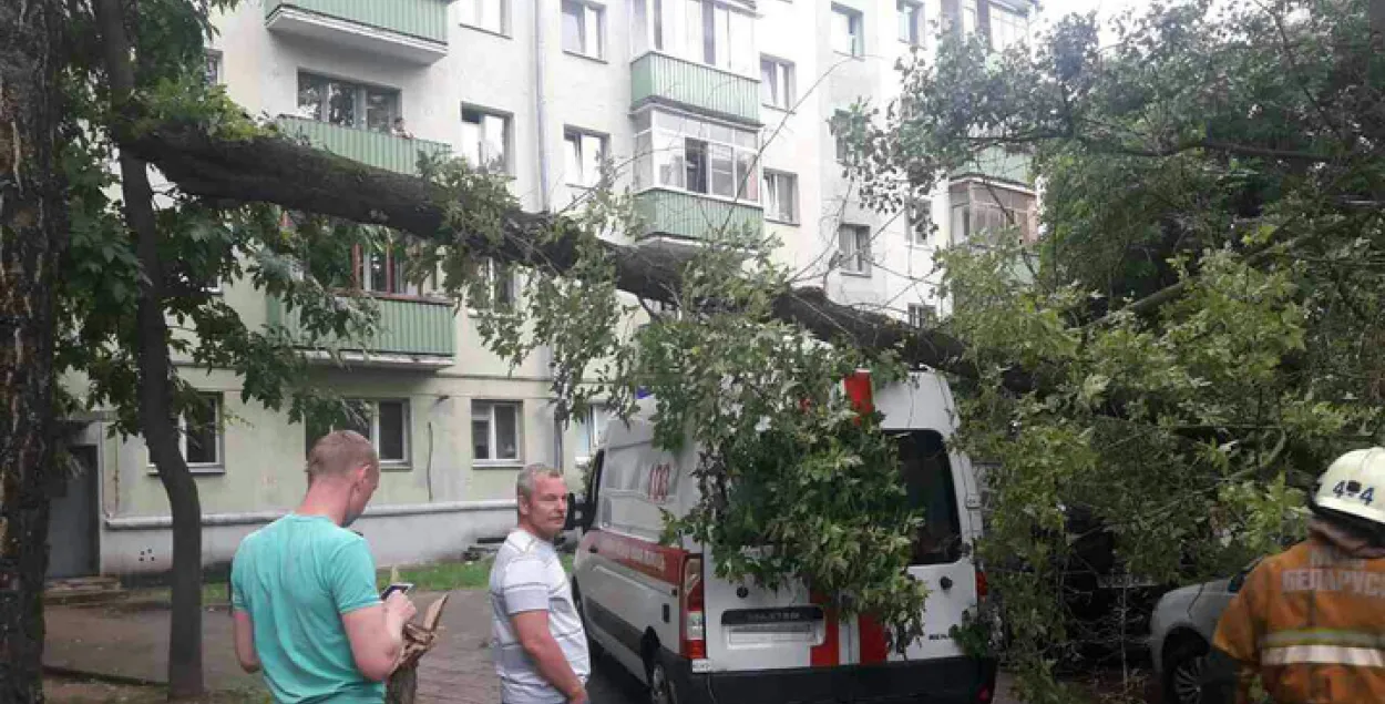 В Минске сильный ветер повалил дерево на три авто, в том числе скорую помощь