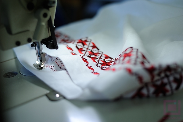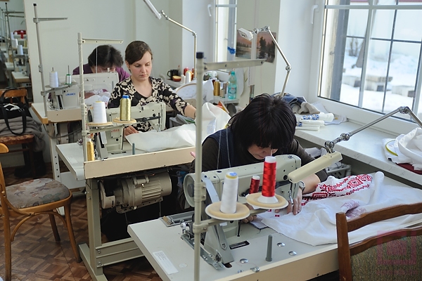 А это швейный цех, где вышиваются сорочки, столовое белье, салфетки, разрабатываются стилизации слуцких поясов. Здесь же придумали панно по слуцким поясам, которые, кстати, используются для подарков почетным гостям.