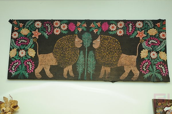 Уголок с вещами, привезенными из экспедиций: их или кто-то дарит, или предприятие даже выкупает и приводит в хороший вид. Вот, например, писанка по льну со львами. Когда-то были художники, которые ходили по деревням и предлагали хозяевам оставить для красоты такую писанку.