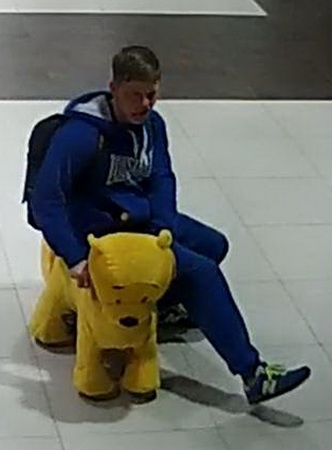 Камеры видеонаблюдения зафиксировали парня в синем спортивном костюме. Разговаривая по мобильнику, он присел на детский электромобиль в виде медвежонка. Отталкиваясь ногами, парень покатался на медвежонке по фойе, а затем выехал на улицу. Потом он исчез в неизвестном направлении.
