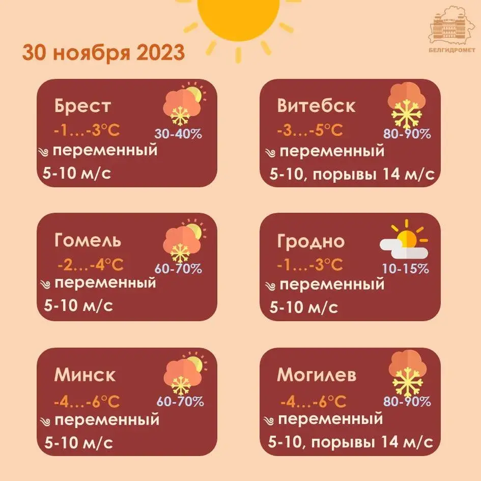 Ночью в четверг, 30 ноября, осадки (снег, мокрый снег) пройдут почти по всей Беларуси (в отдельных районах — метель), днем — преимущественно по северо-востоку (ночью и утром там прогнозируется сильный снег). Местами возможны слабый гололед и налипание мокрого снега. В ночные часы и утром в отдельных районах порывы ветра будут достигать 15-18 м/с.