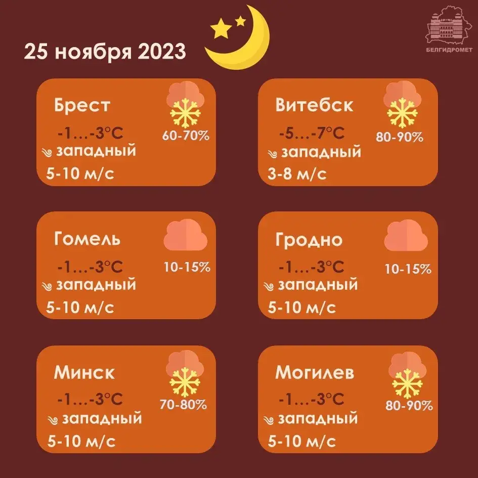 В ночные часы температура воздуха составит 1-5 градусов мороза (в Минске — от -1 до -3, на северо-востоке страны — до -9), а в дневные часы — от -4 до +2 (в столице — от -1 до +1 градуса).