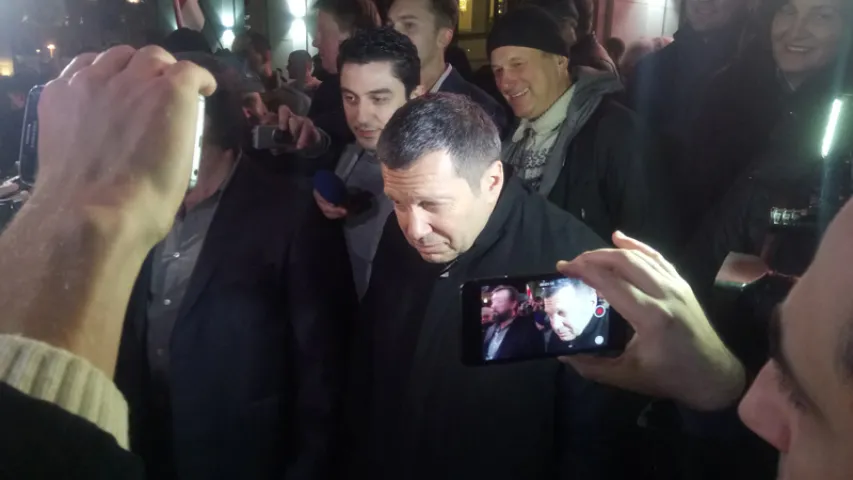 Российский телеведущий Владимир Соловьев вышел из Дворца Республики посмотреть на молодофронтовцев, протестующих против его приезда. Однако до протестующих он не дошел: посмотрел на них со ступенек и вернулся в здание.