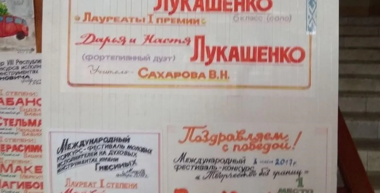 Внучки Александра Лукашенко Дарья и Настя выиграли очередной музыкальный конкурс. Об этом свидетельствует плакат, размещенный в минской музыкальной школе №10 имени Евгения Глебова, где обучаются девочки. Сестер вместе с другими победителями конкурсов поздравляет администрация учебного заведения.