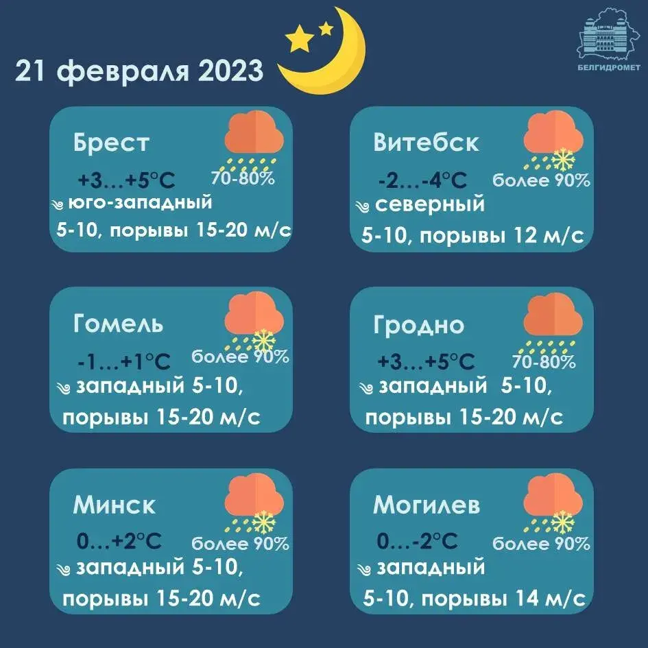 Во вторник, 21 февраля, почти по всей Беларуси будет сильный ветер — с порывами до 15-20 м/с. Днем по юго-западу они достигут местами 21-24 м/с. Синоптики также предупреждают, что ночью по северо-востоку страны прогнозируется сильный снег, местами возможно налипание мокрого снега. В дневные часы кратковременные осадки (снег, мокрый снег, дождь) пройдут почти по всей Беларуси.