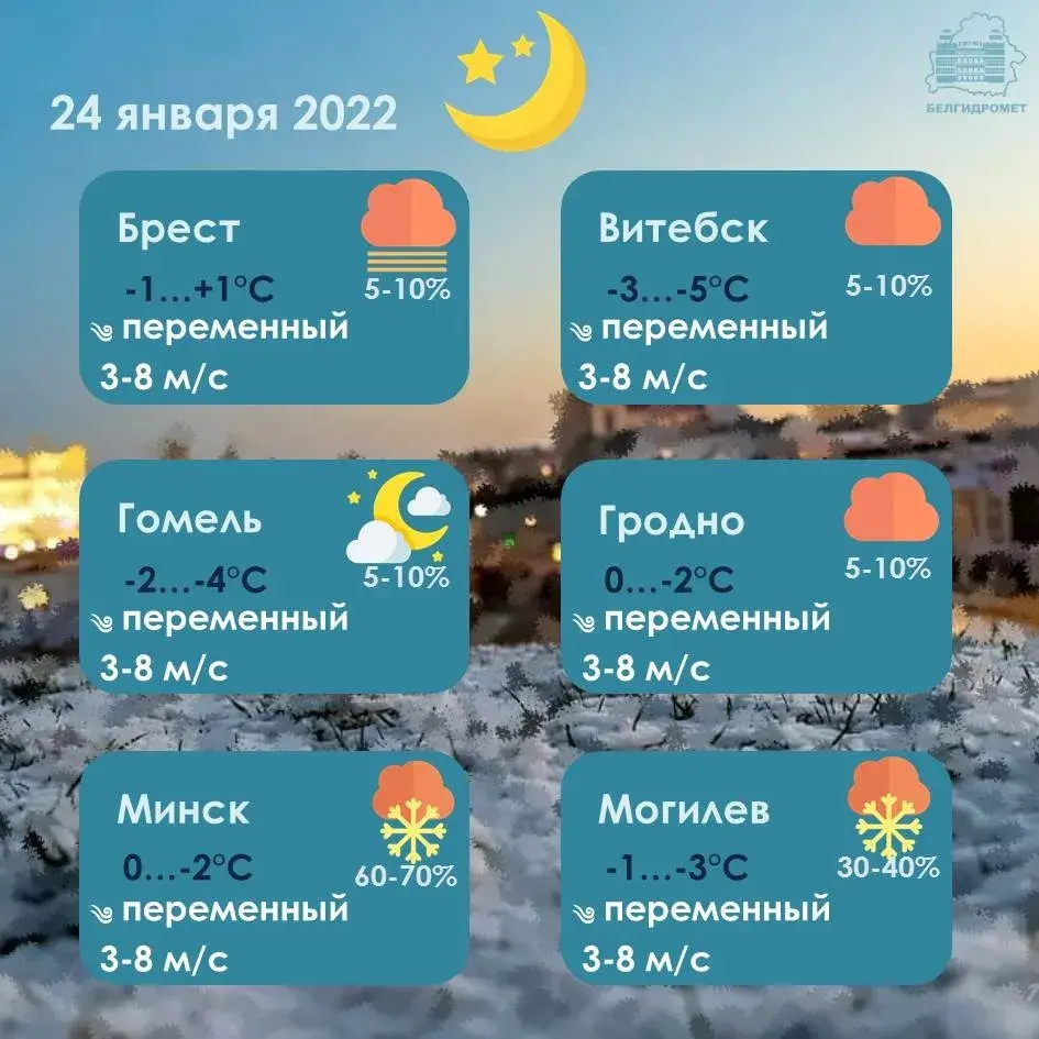 В ночные часы температура воздуха составит от -5 до +1 градуса (при прояснениях — до 8 мороза, в Минске — от 0 до -2), в дневные часы — от -3 до +3 (в столице — от -1 до +1).