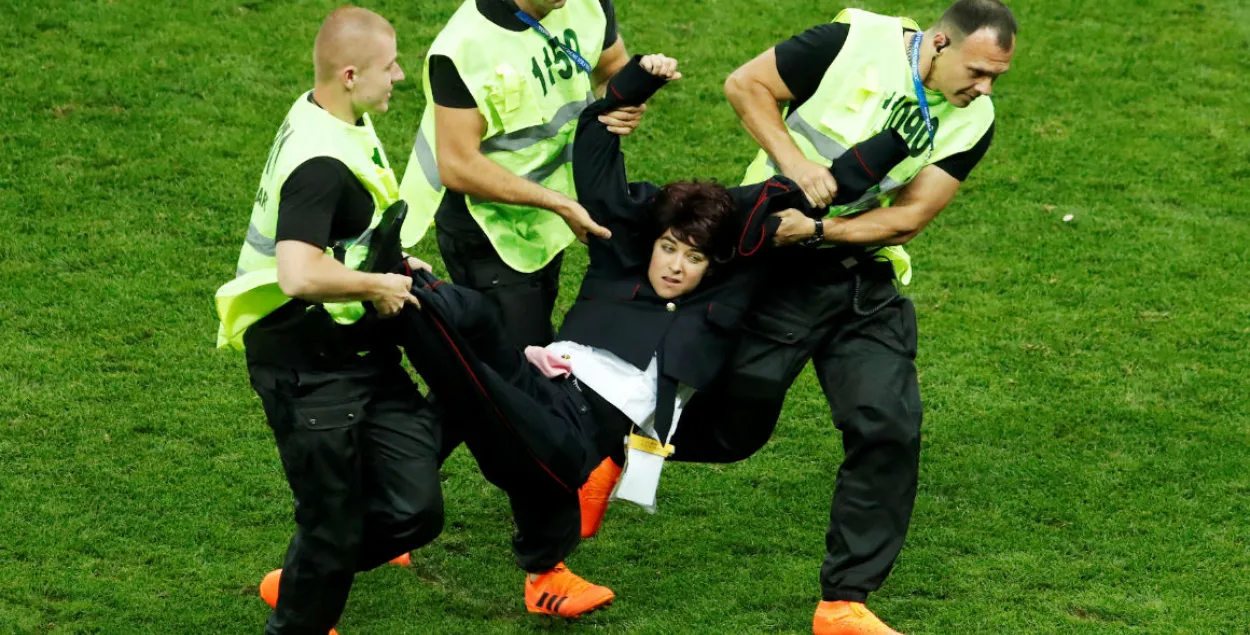 За акцию на московском стадионе "Лужники" в финале чемпионата мира по футболу перед Владимиром Путиным на участников Pussy Riot составили административные протоколы. Четверо человек (Петр Верзилов, Ольга Курачева, Ольга Пахтусова и Ника Никульшина) выбежали на футбольное поле на 50-й минуте. Матч Франция — Хорватия был остановлен, нарушителей задержали. Как стало известно, участники акции потребовали освобождения политзаключенных и создания политической конкуренции в России. Офицер полиции в отделе внутренних дел "Лужники" сказал задержанным: "Я иногда жалею, что сейчас не 37-й год". Это попало на видео.