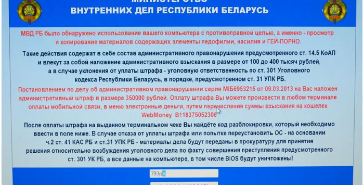 Обвиняемыми по делу проходят трое неработающих граждан России. С ноября 2015-го по февраль 2016 года они рассылали сообщения от имени МВД, будто на граждан налагается административный штраф за просмотр материалов порнографического содержания. При этом хакеры с помощью вируса блокировали компьютерные системы пользователей. Пострадавшим предлагали перевести деньги на счета абонентских номеров одного из белорусских операторов сотовой связи, после чего их компьютеры обещали разблокировать.