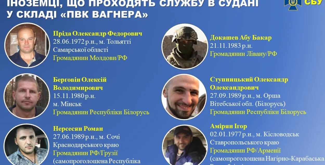 СБУ Украіны апублікавала дадзеныя пра паўтары сотні расійскіх наймітаў з "ПВК Вагнера", якія даказваюць прыналежнасць гэтай неафіцыйнай структуры да вайсковай выведкі Узброеных сілаў РФ. Для гэтага аналізаваліся больш за тысячу пашпартоў вагнераўцаў, якія прыляталі ў афрыканскія краіны, іх афармлялі цэнтралізавана ў Маскве, дзе і дакументы расійскіх агентаў "Пятрова" і "Башырава". Сярод расійскіх наймітаў у Судане ваююць двое беларусаў. Гэта — 38-гадовы Аляксей Бярговін і 29-гадовы Аляксандр Ступніцкі. Раней яны ваявалі супраць украінскіх войскаў на Данбасе.
