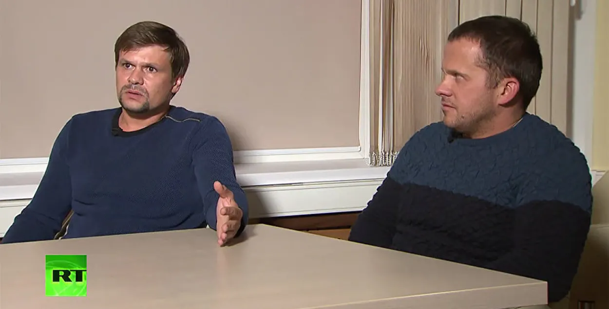 Аляксандр Пятроў і Руслан Башыраў, падазраваныя брытанскімі ўладамі ў датычнасці да атручвання ў сакавіку 2018-га ў Солсберы былога афіцэра ГРУ Сяргея Скрыпаля і яго дачкі Юліі, далі першае інтэрв'ю (расійскаму тэлеканалу RT). Напярэдадні яго анансаваў Уладзімір Пуцін. Што сказалі Пятроў і Башыраў? Пацвердзілі, што гэта іх сапраўдныя прозвішчы (хаця і не паказвалі дакументы), заявілі пра "фантастычнае і фатальнае супадзенне".