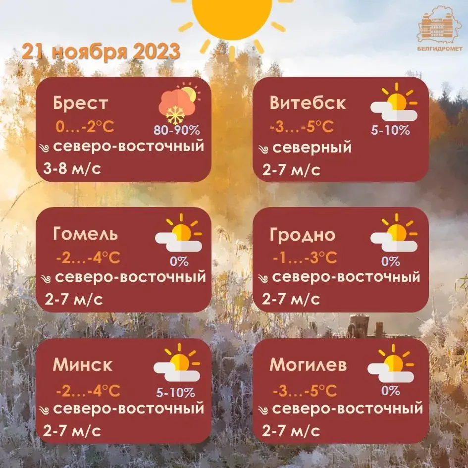У аўторак, 21 лістапада, у Беларусі чакаецца пераменная воблачнасць, паведамляе Белгідрамет.