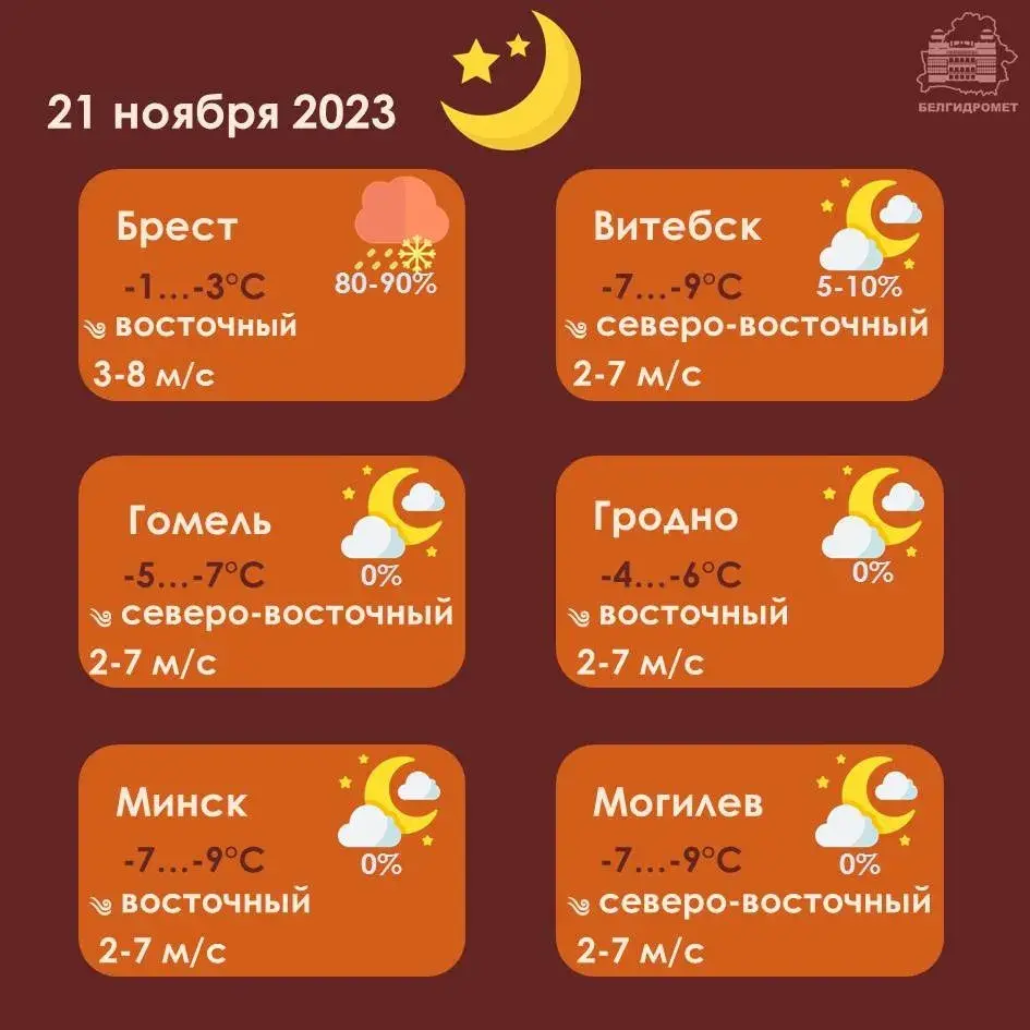 Тэрмометры ўначы пакажуць 5-11 ніжэй за нуль, па паўднёвым захадзе будзе 1-4 марозу. Удзень прагназуецца ад 0 да -6.