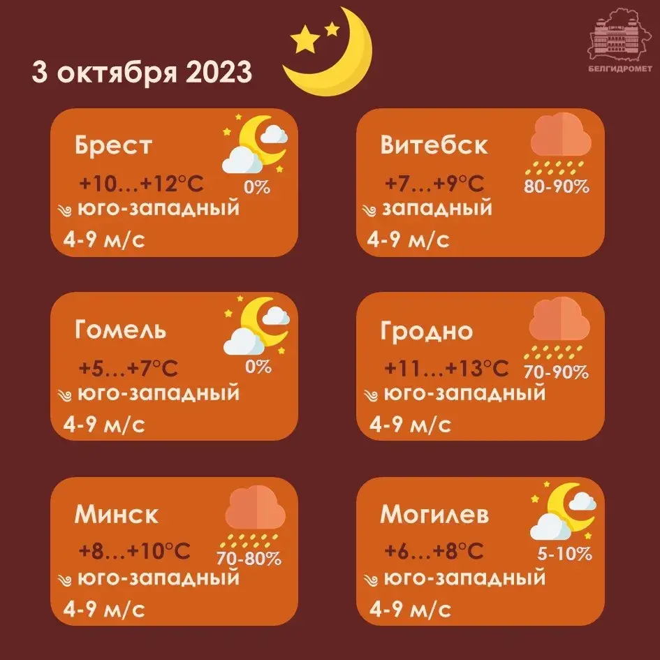 Уначы і зранку на большай частцы тэрыторыі краіны пройдуць дажджы. Удзень яны чакаюцца пераважна ў паўночна-ўсходніх раёнах. Уначы і зранку ў асобных раёнах прагназуецца слабы туман. Вецер будзе паўднёва-заходні ўмераны, удзень — парывісты, месцамі моцны парывісты (да 15-20 м/с).
