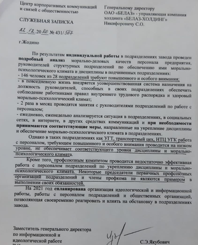 — Па палітычных матывах ніхто нікога не трэціруе. Мы за перакананні людзей не чапаем і не збіраемся чапаць. Галоўнае — работнік павінен якасны самазвал рабіць, — расказвае Еўрарадыё Станіслаў Якубовіч. Ідэолаг сцвярджае, што згаданыя 146 чалавек — не бунтары-забастоўшчыкі, а людзі, схільныя да алкагалізму, наркаманіі і бытавога гвалту. Уважліва з імі трэба сябе паводзіць менавіта таму.