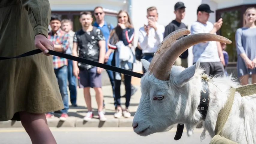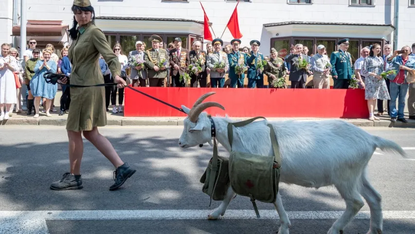 На чале калоны вялі жывога казла: кажуць, ён сапраўды прысутнічаў на гістарычным парадзе 1944 года. Дзеля акцыі жывёлу пазычылі ў мінскім заапарку.