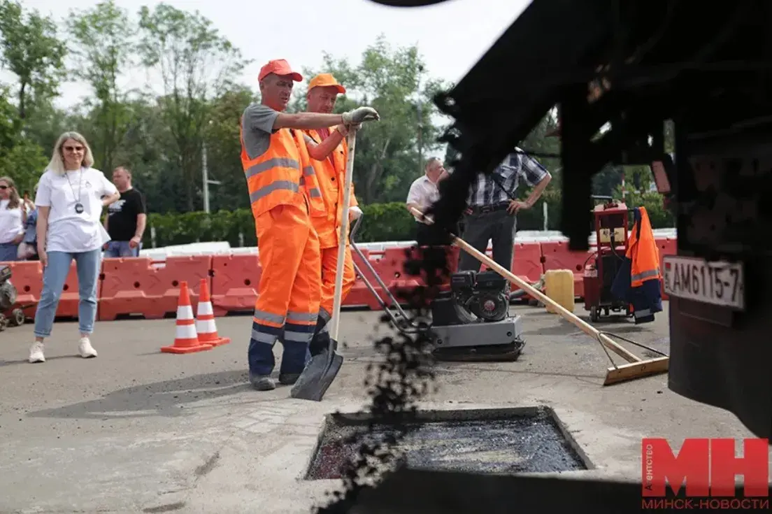 У Мінску наладзілі спаборніцтвы сярод майстроў "ямачнага рамонту". Для атрымання выдатных вынікаў патрэбна была не толькі якасць работ, але і хуткасць — прысутнічаў суддзя з секундамерам.
