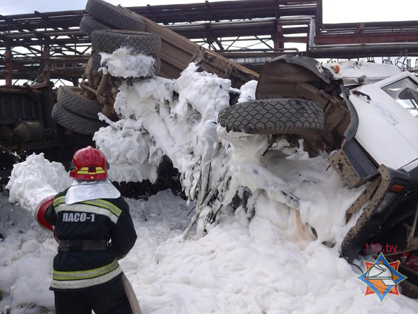 Каб прадухіліць узгаранне дызельнага паліва, разлітага з бака аўтамабіля МАЗ, пры дапамозе генератара пены створаная паветрана-пенная падушка.