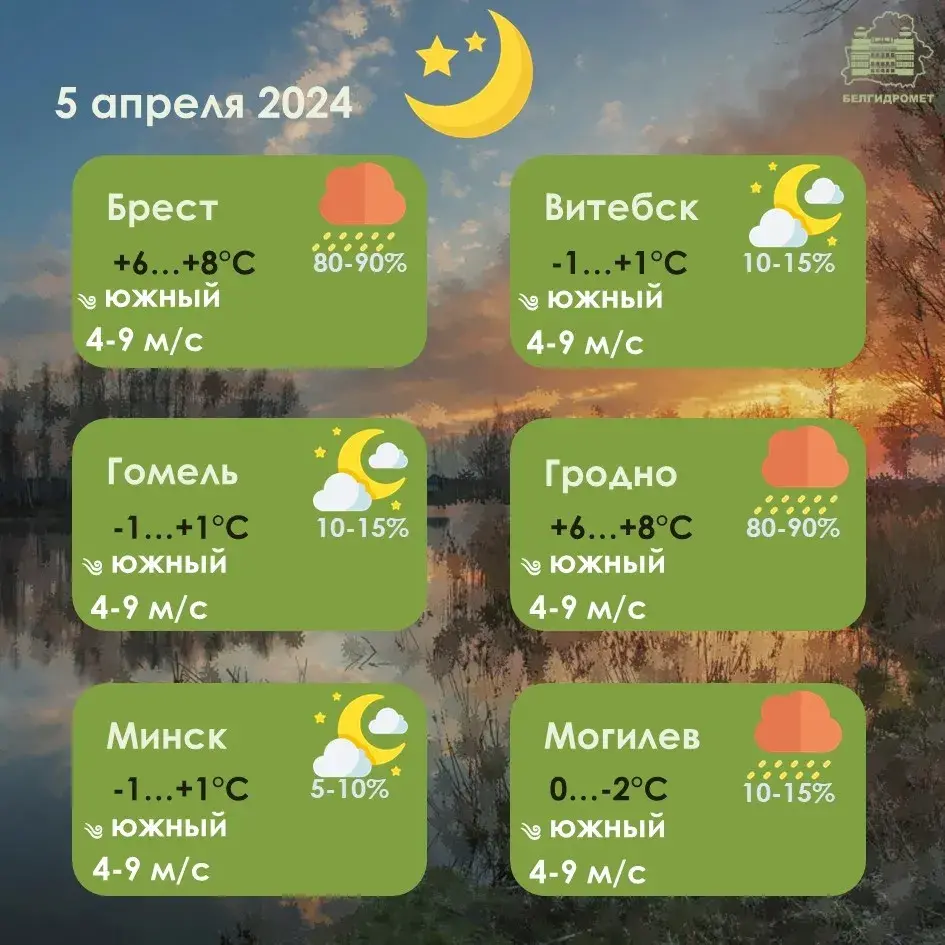 У пятніцу, 5 красавіка, у Беларусі магчымыя мокры снег і дождж (уначы — на захадзе, удзень — амаль па ўсёй краіне). Сіноптыкі папярэджваюць пра галадзёдзіцу, якая захаваецца на асобных участках дарог.