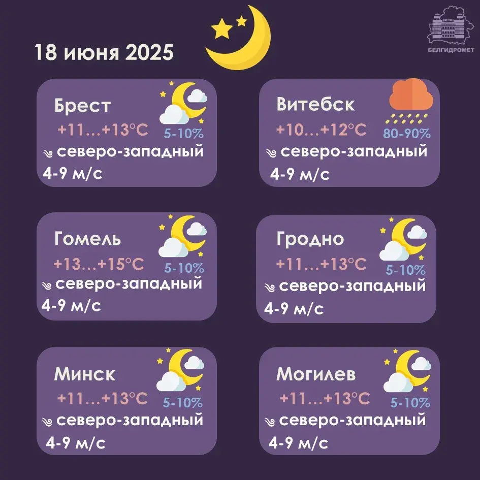 У сераду, 18 чэрвеня, у Беларусі ўначы прагназуецца пераменная воблачнасць, паведамляе Белгідрамет.