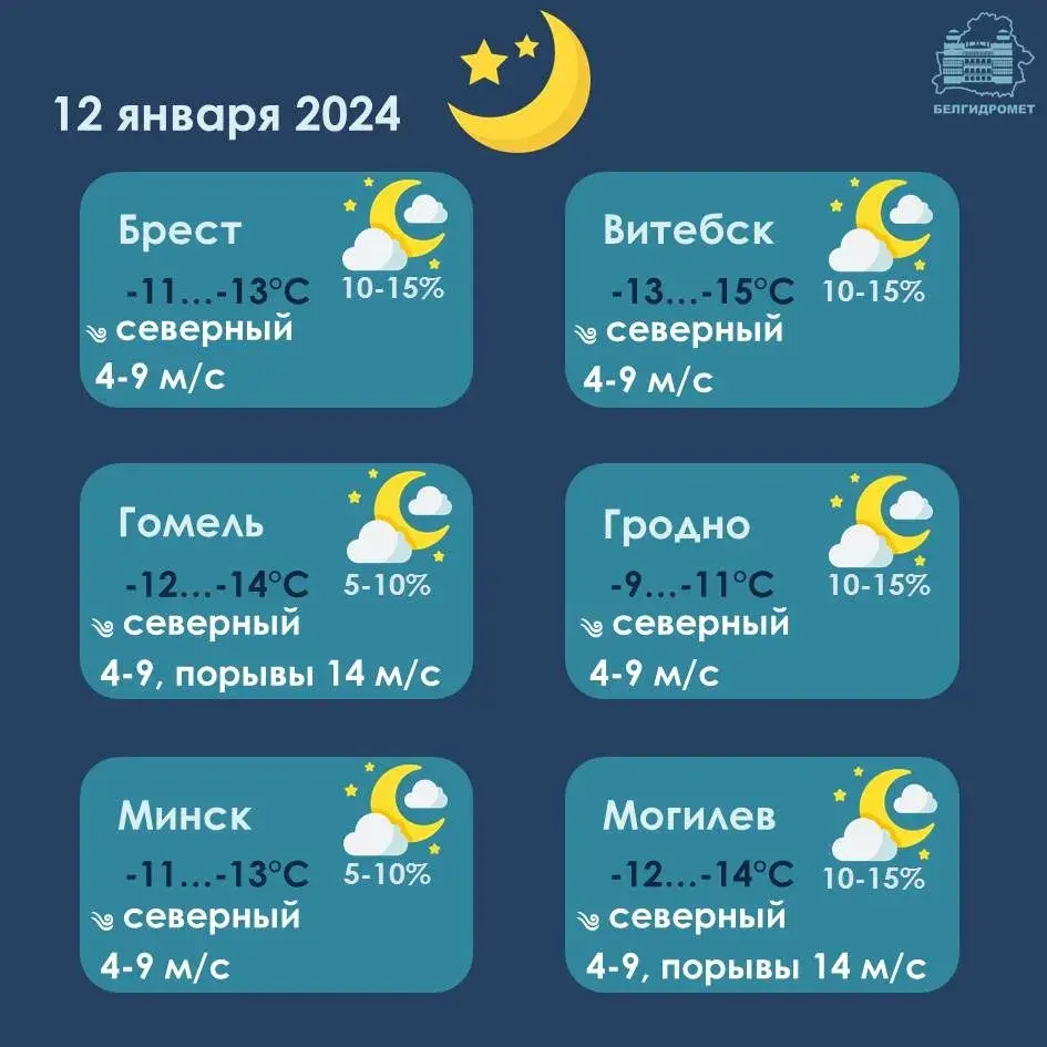 У начныя гадзіны тэмпература паветра складзе ад -9 да -15 градусаў (месцамі — да -19), у дзённыя гадзіны — ад -4 да -10 (на захадзе — ад 0 да -3).