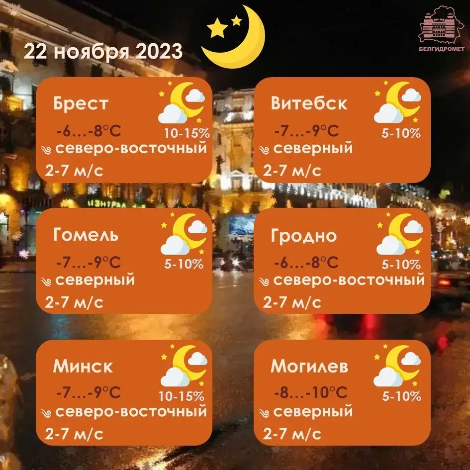 Істотных ападкаў не прагназуецца, толькі ўначы па поўдні краіны месцамі пройдзе невялікі снег. На асобных участках дарог чакаецца галалёдзіца. Вецер будзе паўночны, паўночна-ўсходні слабы да ўмеранага.