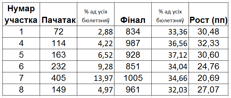 А вось скончылася датэрміновае галасаванне з прыкладна аднолькавымі вынікамі. На ўчасткі прыйшло прагаласаваць ад 32% (мінімум на ўчастку №8) да 37,1% (максімум на ўчастку №5) выбаршчыкаў.