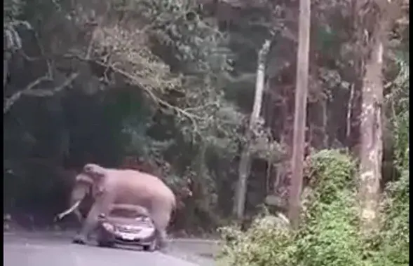 У Тайландзе слон прылёг на аўтамабіль з турыстамі (відэа)